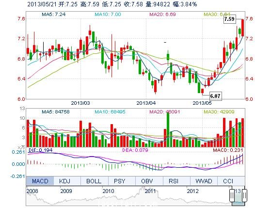 今開: 7.25 成交量: 9.48萬手 振幅: 4.66% 最高: 7.59 成交額: 7092.26萬元 換手率: 3.45% 最低: 7.25 總市值: 21.60億 市凈率: 3.43 昨收: 7.30 流通市值: ...