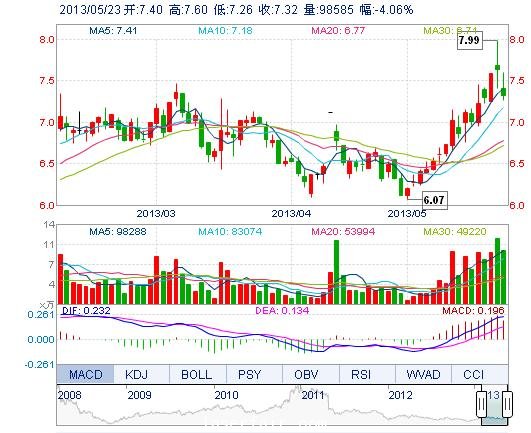 今開: 7.40 成交量: 9.86萬手 振幅: 4.46% 最高: 7.60 成交額: 7303.69萬元 換手率: 3.59% 最低: 7.26 總市值: 20.86億 市凈率: 3.32 昨收: 7.63 流通市值: ...
