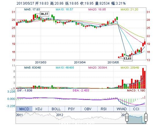 今開: 18.83 成交量: 8.25萬手 振幅: 11.43% 最高: 20.86 成交額: 1.60億元 換手率: 38.37% 最低: 18.65 總市值: 13.97億 市凈率: 2.44 昨收: 19.33 流通市值...