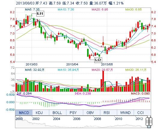 今開(kāi): 7.43 成交量: 36.07萬(wàn)手 振幅: 3.37% 最高: 7.59 成交額: 2.70億元 換手率: 4.05% 最低: 7.34 總市值: 66.83億 市凈率: 2.54 昨收: 7.41 流通市值: 66...