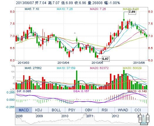 今開: 7.04 成交量: 2.68萬手 振幅: 2.56% 最高: 7.07 成交額: 1867.82萬元 換手率: 0.98% 最低: 6.89 總市值: 19.84億 市凈率: 3.15 昨收: 7.03 流通市值: ...