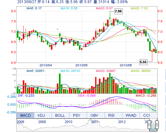 今  開(kāi): 6.14 成交量: 3.10萬(wàn)手 振  幅: 4.71%