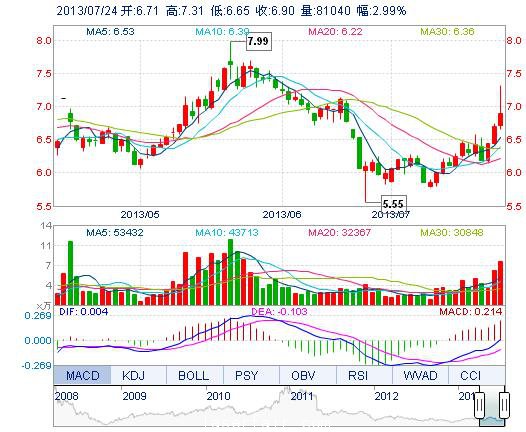 今開: 6.71 成交量: 8.10萬手 振幅: 9.85% 最高: 7.31 成交額: 5621.77萬元 換手率: 2.95% 最低: 6.65 總市值: 19.67億 市凈率: 3.13 昨收: 6.70 流通市值: ...