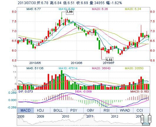 今開: 6.78 成交量: 3.49萬手 振幅: 4.85% 最高: 6.84 成交額: 2323.63萬元 換手率: 1.27% 最低: 6.51 總市值: 19.07億 市凈率: 3.03 昨收: 6.80 流通市值: ...