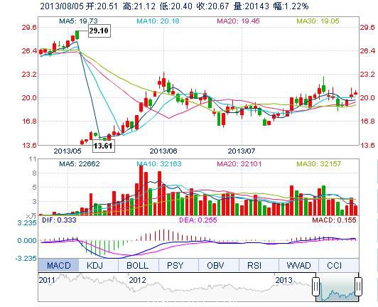 | 今 開: | 20.51 | 成交量: | 2.01萬手 | 振 幅: | 3.53% |