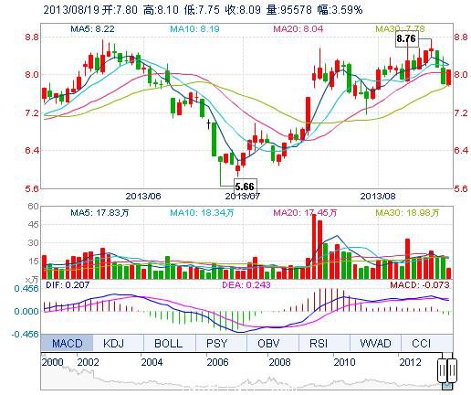今開: 7.80 成交量: 9.56萬手 振幅: 4.48% 最高: 8.10 成交額: 7633.34萬元 換手率: 2.19% 最低: 7.75 總市值: 35.34億 市凈率: 2.52 昨收: 7.81 流通市值: ...