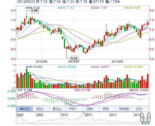 今開: 7.25 成交量: 8.72萬手 振幅: 4.27% 最高: 7.54 成交額: 6435.14萬元 換手率: 3.17% 最低: 7.23 總市值: 21.06億 市凈率: 3.35 昨收: 7.26 流通市值: ...