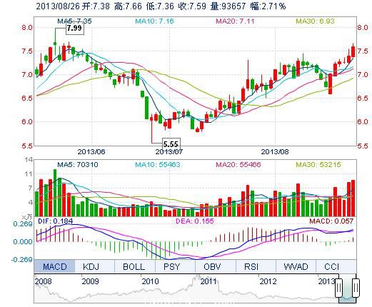 今開: 7.38 成交量: 9.37萬手 振幅: 4.06% 最高: 7.66 成交額: 7083.72萬元 換手率: 3.41% 最低: 7.36 總市值: 21.63億 市凈率: 3.53 昨收: 7.39 流通市值: ...