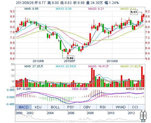 今開(kāi): 8.77 成交量: 34.30萬(wàn)手 振幅: 4.17% 最高: 9.00 成交額: 3.01億元 換手率: 7.85% 最低: 8.63 總市值: 39.22億 市凈率: 2.80 昨收: 8.87 流通市值: 39...