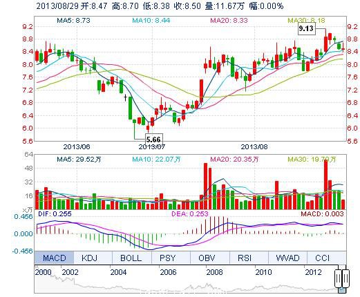 今開: 8.47 成交量: 11.67萬手 振幅: 3.76% 最高: 8.70 成交額: 9957.32萬元 換手率: 2.67% 最低: 8.38 總市值: 37.13億 市凈率: 2.64 昨收: 8.50 流通市值:...