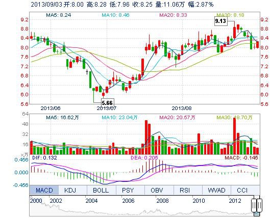 今開: 8.00 成交量: 11.06萬手 振幅: 3.99% 最高: 8.28 成交額: 9019.45萬元 換手率: 2.53% 最低: 7.96 總市值: 36.04億 市凈率: 2.56 昨收: 8.02 流通市值:...