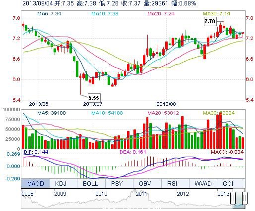 今開: 7.35 成交量: 2.94萬手 振幅: 1.64% 最高: 7.38 成交額: 2151.14萬元 換手率: 1.07% 最低: 7.26 總市值: 21.00億 市凈率: 3.43 昨收: 7.32 流通市值: ...