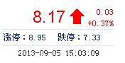 今開: 8.14 成交量: 9.62萬手 振幅: 2.70% 最高: 8.26 成交額: 7828.74萬元 換手率: 2.20% 最低: 8.04 總市值: 35.69億 市凈率: 2.54 昨收: 8.14 流通市值: ...