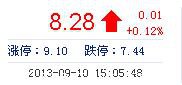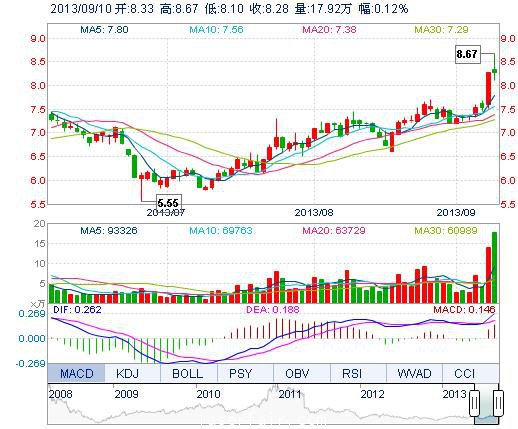 今開: 8.33 成交量: 17.92萬手 振幅: 6.89% 最高: 8.67 成交額: 1.50億元 換手率: 6.52% 最低: 8.10 總市值: 23.60億 市凈率: 3.85 昨收: 8.27 流通市值: 22...