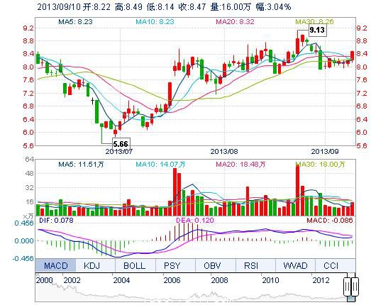 今開: 8.22 成交量: 16.00萬(wàn)手 振幅: 4.26% 最高: 8.49 成交額: 1.34億元 換手率: 3.66% 最低: 8.14 總市值: 37.00億 市凈率: 2.63 昨收: 8.22 流通市值: 37...
