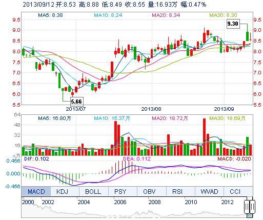 今開: 8.53 成交量: 16.93萬手 振幅: 4.58% 最高: 8.88 成交額: 1.47億元 換手率: 3.88% 最低: 8.49 總市值: 37.35億 市凈率: 2.66 昨收: 8.51 流通市值: 37...