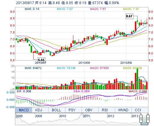 | 最 高: | 8.49 | 成交額: | 5579.56萬(wàn)元 | 換手率: | 2.45% |