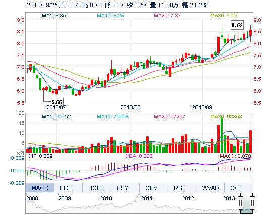 今開: 8.34 成交量: 11.38萬手 振幅: 8.45% 最高: 8.78 成交額: 9556.69萬元 換手率: 4.14% 最低: 8.07 總市值: 24.42億 市凈率: 3.98 昨收: 8.40 流通市值:...
