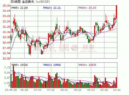 金運(yùn)激光[10.00% 資金 研報(bào)](300220)10月11日走強(qiáng),截至13:45,該股漲停,現(xiàn)報(bào)25.09元,漲10.00%,成交額為6195.80萬(wàn)元。