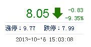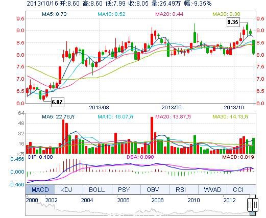 今開: 8.60 成交量: 25.49萬手 振幅: 6.87% 最高: 8.60 成交額: 2.10億元 換手率: 5.83% 最低: 7.99 總市值: 35.16億 市凈率: 2.50 昨收: 8.88 流通市值: 35...