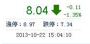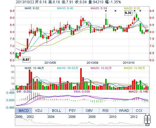 今開: 8.16 成交量: 9.42萬手 振幅: 3.07% 最高: 8.16 成交額: 7556.28萬元 換手率: 2.16% 最低: 7.91 總市值: 35.12億 市凈率: 2.50 昨收: 8.15 流通市值: ...