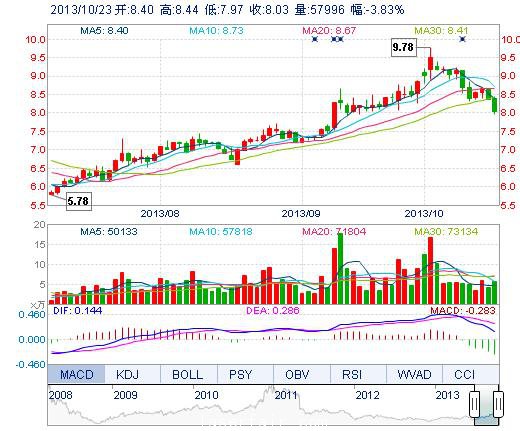 | 最 高: | 8.44 | 成交額: | 4724.93萬(wàn)元 | 換手率: | 2.11% |