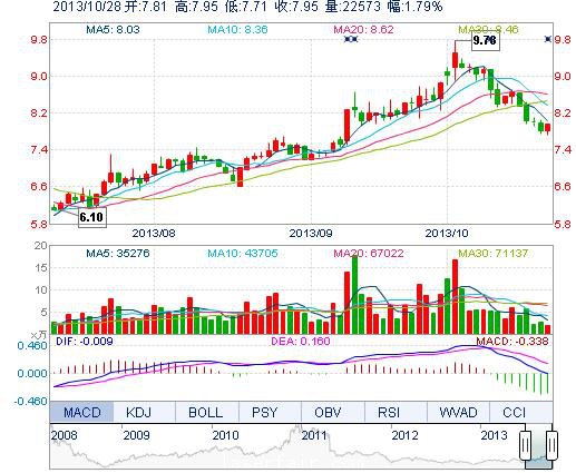 今開: 7.81 成交量: 2.26萬手 振幅: 3.07% 最高: 7.95 成交額: 1774.18萬元 換手率: 0.82% 最低: 7.71 總市值: 22.66億 市凈率: 3.70 昨收: 7.81 流通市值: ...