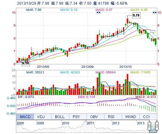 今開: 7.98 成交量: 4.18萬手 振幅: 8.05% 最高: 7.98 成交額: 3167.32萬元 換手率: 1.52% 最低: 7.34 總市值: 21.38億 市凈率: 3.43 昨收: 7.95 流通市值: ...