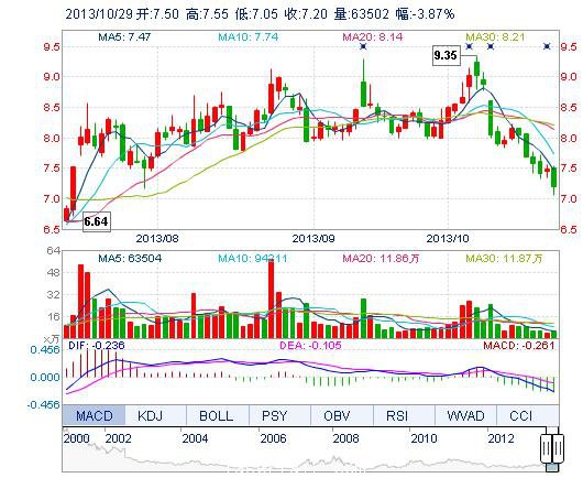 今開: 7.50 成交量: 6.35萬手 振幅: 6.68% 最高: 7.55 成交額: 4619.90萬元 換手率: 1.45% 最低: 7.05 總市值: 31.45億 市凈率: 2.30 昨收: 7.49 流通市值: ...