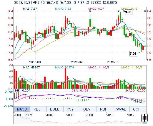 今開: 7.40 成交量: 3.79萬(wàn)手 振幅: 2.04% 最高: 7.48 成交額: 2801.29萬(wàn)元 換手率: 0.87% 最低: 7.33 總市值: 32.19億 市凈率: 2.36 昨收: 7.37 流通市值: ...