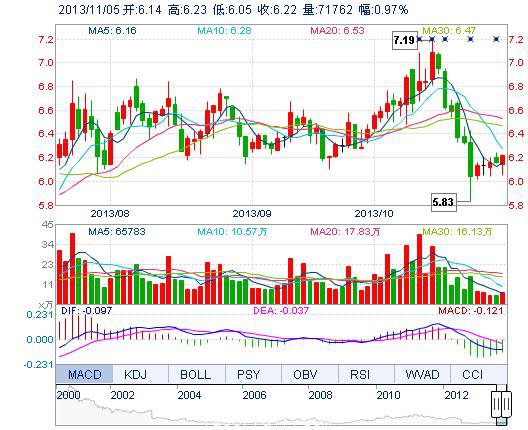今開(kāi): 6.14 成交量: 7.18萬(wàn)手 振幅: 2.92% 最高: 6.23 成交額: 4413.56萬(wàn)元 換手率: 0.81% 最低: 6.05 總市值: 55.43億 市凈率: 2.05 昨收: 6.16 流通市值: ...