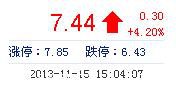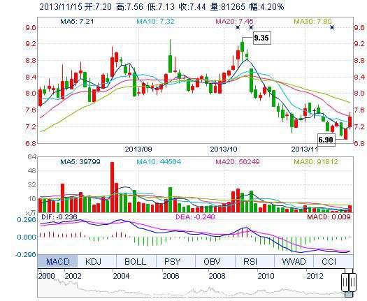 今開: 7.20 成交量: 8.13萬手 振幅: 6.02% 最高: 7.56 成交額: 6008.32萬元 換手率: 1.86% 最低: 7.13 總市值: 32.50億 市凈率: 2.38 昨收: 7.14 流通市值: ...