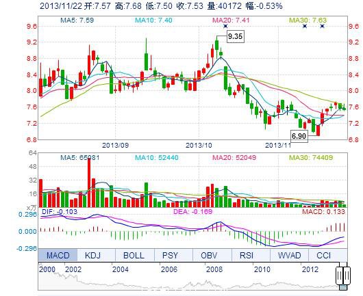 今開: 7.57 成交量: 4.02萬手 振幅: 2.38% 最高: 7.68 成交額: 3044.86萬元 換手率: 0.92% 最低: 7.50 總市值: 32.89億 市凈率: 2.41 昨收: 7.57 流通市值: ...
