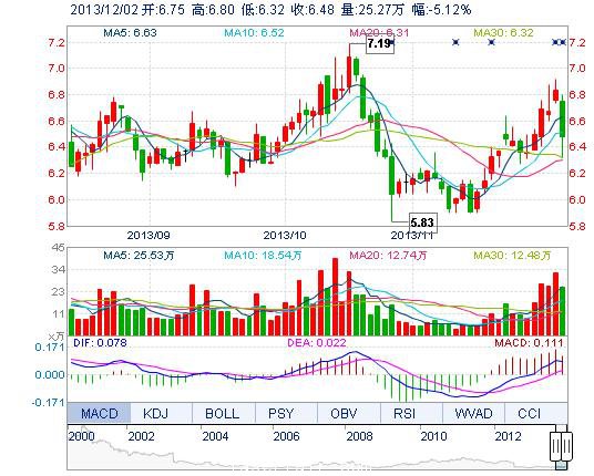 今開(kāi): 6.75 成交量: 25.27萬(wàn)手 振幅: 7.03% 最高: 6.80 成交額: 1.66億元 換手率: 2.84% 最低: 6.32 總市值: 57.74億 市凈率: 2.14 昨收: 6.83 流通市值: 57...