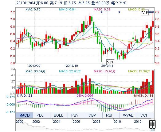 今開: 6.80 成交量: 50.88萬手 振幅: 6.47% 最高: 7.19 成交額: 3.56億元 換手率: 5.71% 最低: 6.75 總市值: 61.93億 市凈率: 2.30 昨收: 6.80 流通市值: 61...