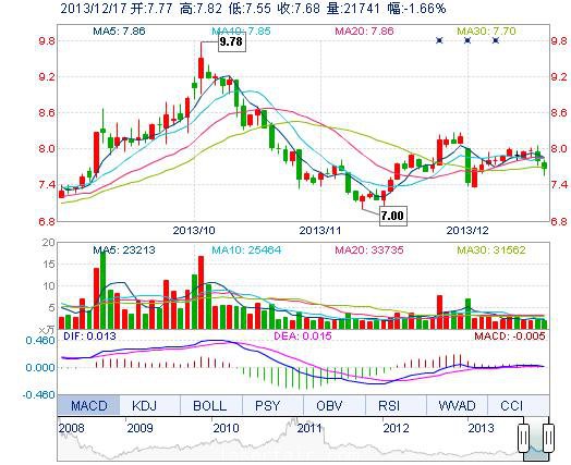 今開: 7.77 成交量: 2.17萬手 振幅: 3.46% 最高: 7.82 成交額: 1663.82萬元 換手率: 0.79% 最低: 7.55 總市值: 21.89億 市凈率: 3.51 昨收: 7.81 流通市值: ...
