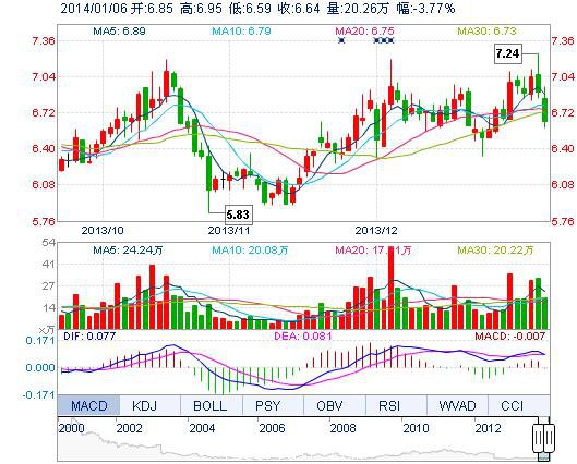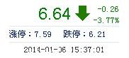 今開: 6.85 成交量: 20.26萬手 振幅: 5.22% 最高: 6.95 成交額: 1.37億元 換手率: 2.27% 最低: 6.59 總市值: 59.17億 市凈率: 2.19 昨收: 6.90 流通市值: 59...