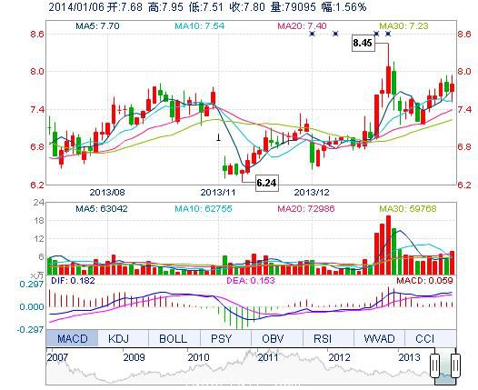 今開: 7.68 成交量: 7.91萬(wàn)手 振幅: 5.73% 最高: 7.95 成交額: 6147.84萬(wàn)元 換手率: 3.97% 最低: 7.51 總市值: 15.54億 市凈率: 3.16 昨收: 7.68 流通市值: ...