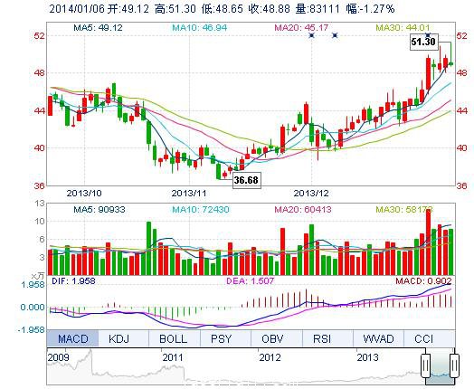 | 最 高: | 51.30 | 成交額: | 4.16億元 | 換手率: | 2.89% |