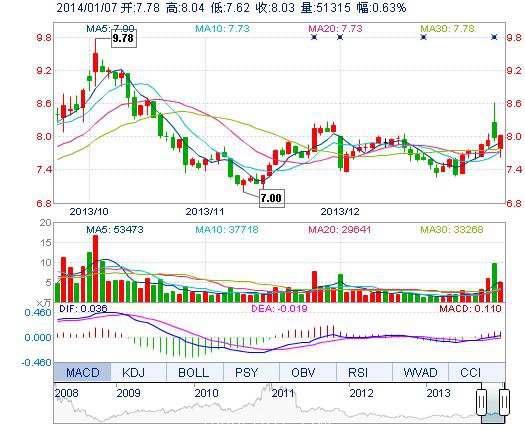 今開: 7.78 成交量: 5.13萬手 振幅: 5.26% 最高: 8.04 成交額: 4012.26萬元 換手率: 1.87% 最低: 7.62 總市值: 22.89億 市凈率: 3.67 昨收: 7.98 流通市值: ...