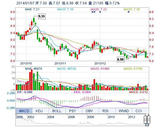 今開: 7.00 成交量: 2.12萬手 振幅: 1.29% 最高: 7.07 成交額: 1489.15萬元 換手率: 0.49% 最低: 6.98 總市值: 30.75億 市凈率: 2.25 昨收: 6.99 流通市值: ...