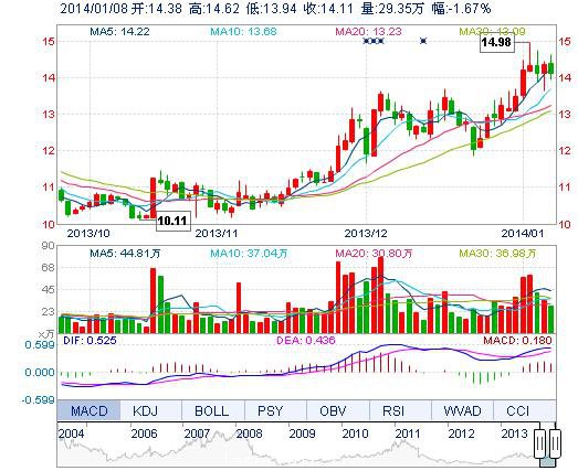 今開: 14.38 成交量: 29.35萬手 振幅: 4.74% 最高: 14.62 成交額: 4.18億元 換手率: 3.10% 最低: 13.94 總市值: 147.36億 市凈率: 4.22 昨收: 14.35 流通市值...
