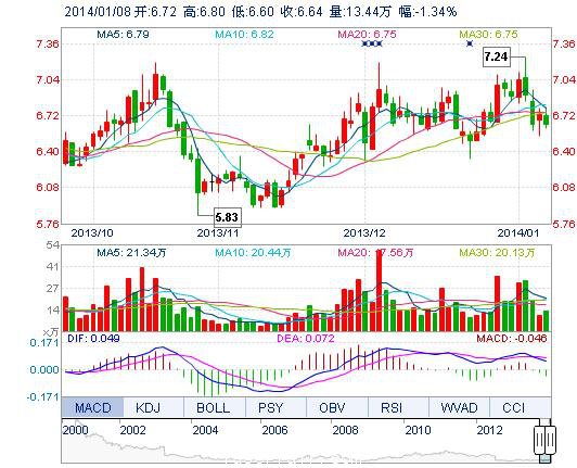 今開: 6.72 成交量: 13.44萬手 振幅: 2.97% 最高: 6.80 成交額: 8990.58萬元 換手率: 1.51% 最低: 6.60 總市值: 59.17億 市凈率: 2.19 昨收: 6.73 流通市值:...