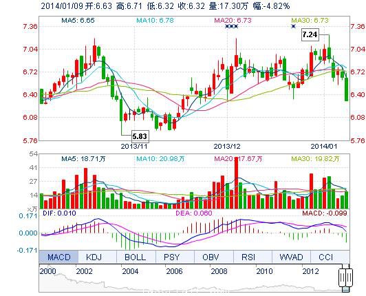 今開: 6.63 成交量: 17.30萬手 振幅: 5.87% 最高: 6.71 成交額: 1.13億元 換手率: 1.94% 最低: 6.32 總市值: 56.32億 市凈率: 2.09 昨收: 6.64 流通市值: 56...