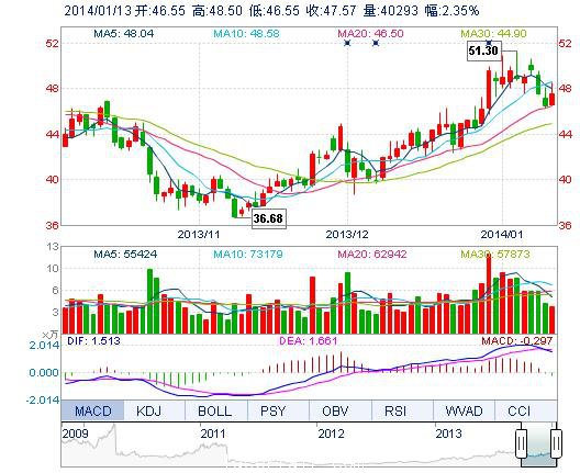 今開: 46.55 成交量: 4.03萬手 振幅: 4.20% 最高: 48.50 成交額: 1.92億元 換手率: 1.40% 最低: 46.55 總市值: 141.60億 市凈率: 9.32 昨收: 46.48 流通市值...