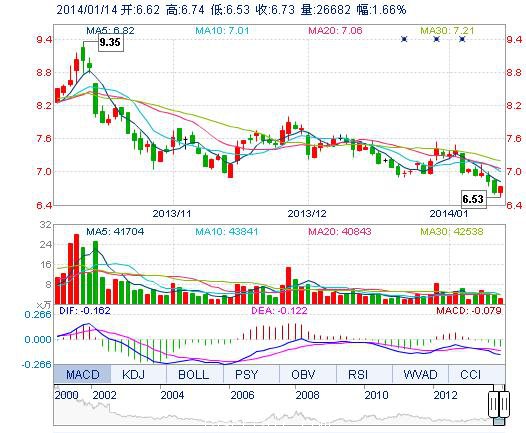 今開: 6.62 成交量: 2.67萬手 振幅: 3.17% 最高: 6.74 成交額: 1781.23萬元 換手率: 0.61% 最低: 6.53 總市值: 29.40億 市凈率: 2.15 昨收: 6.62 流通市值: ...