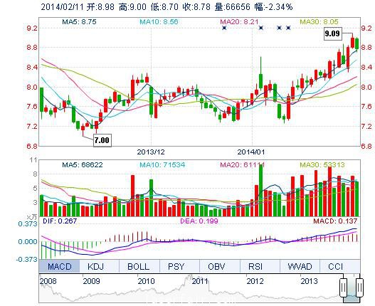 今開: 8.98 成交量: 6.67萬手 振幅: 3.34% 最高: 9.00 成交額: 5903.66萬元 換手率: 2.42% 最低: 8.70 總市值: 25.02億 市凈率: 4.01 昨收: 8.99 流通市值: ...