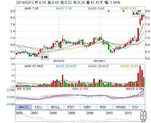 | 最 高: | 8.45 | 成交額: | 3.44億元 | 換手率: | 4.65% |
