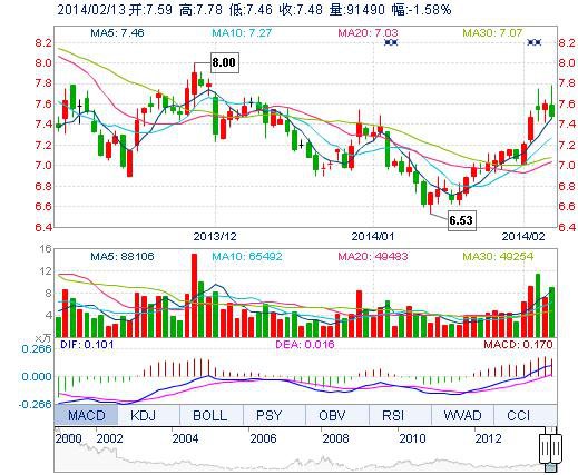 今開: 7.59 成交量: 9.15萬手 振幅: 4.21% 最高: 7.78 成交額: 7001.24萬元 換手率: 2.09% 最低: 7.46 總市值: 32.67億 市凈率: 2.39 昨收: 7.60 流通市值: ...