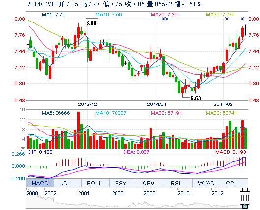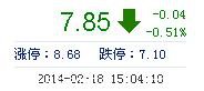 | 今 開: | 7.85 | 成交量: | 8.56萬手 | 振 幅: | 2.79% |